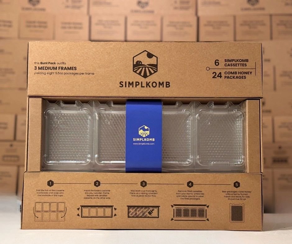 SimplKomb Bunt Pack (24 Cassettes) Bunt Pack · $37.99 is a comb honey production pack used by beekeepers to make comb honey inside the hive. SimplKomb is an in-hive system where bees build honeycomb directly into consumer-ready packages, eliminating messy cutting and packaging steps. What’s Included -The Bunt Pack is sized for three standard medium frames in a Langstroth hive. -It typically includes 6 SimplKomb cassettes and 2 follower sheets which help ensure the bees build the comb level. -Each cassette has 4 individual consumer packages , so the full Bunt Pack can yield up to 24 comb honey servings when filled by the bees. – All cassettes must be waxed before use to insure a proper honey yield.