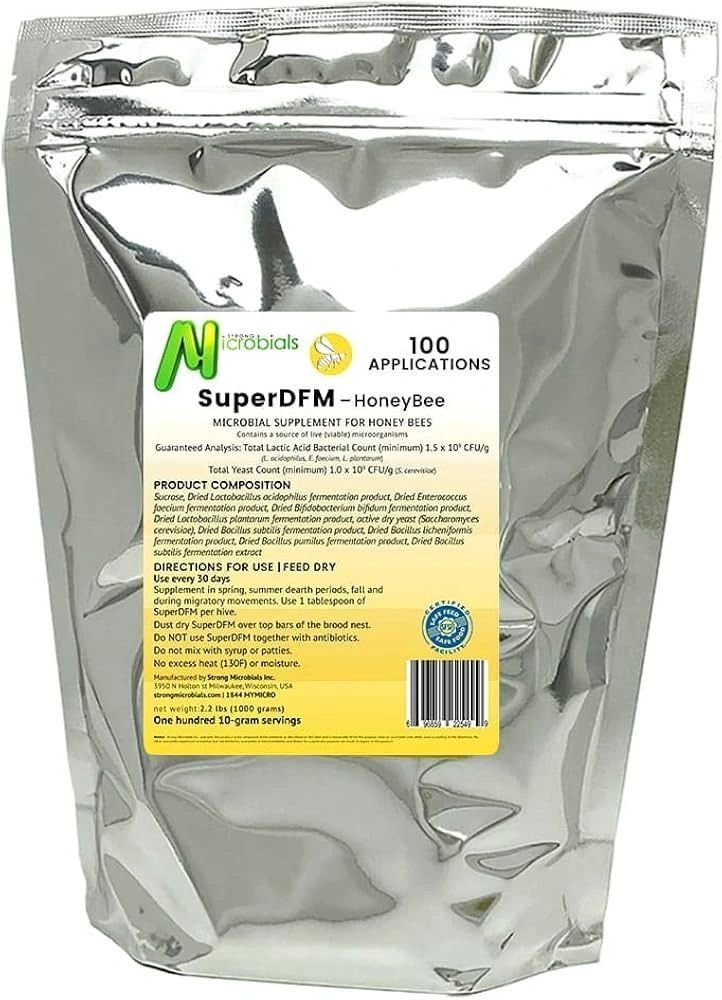 Strong Microbials ( 100 Application/1000g ) Super DFM is a probiotic that aids in promoting optimal gut health. A balanced gut microbiome helps to optimize digestion and nutrition. In turn, this increases the bee’s ability to help combat chalkbrood, and Nosema, activate the detoxification of pesticides, and increase hive immunity. Super DFM is a blend of 6 probiotic bacteria that aids in replenishing the microbes lost due to agricultural modifications of honey bees’ environment. It’s all-natural and completely safe to use, even during honey flow!